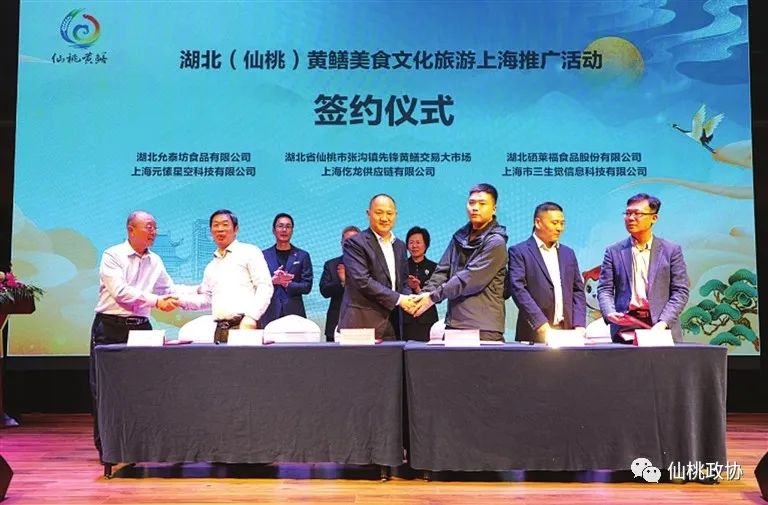 仙桃张沟先锋交易大市场、允泰坊食品、硒莱福食品与上海餐饮商贸企业元愫星空科技、三生觉信息科技、仡龙供应链签订购销协议总金额6.2亿元。湖北海外旅游集团与徐霞客中国旅行商商会签订向仙桃组织350个华东疗休养团、输客15000人的合作协议。