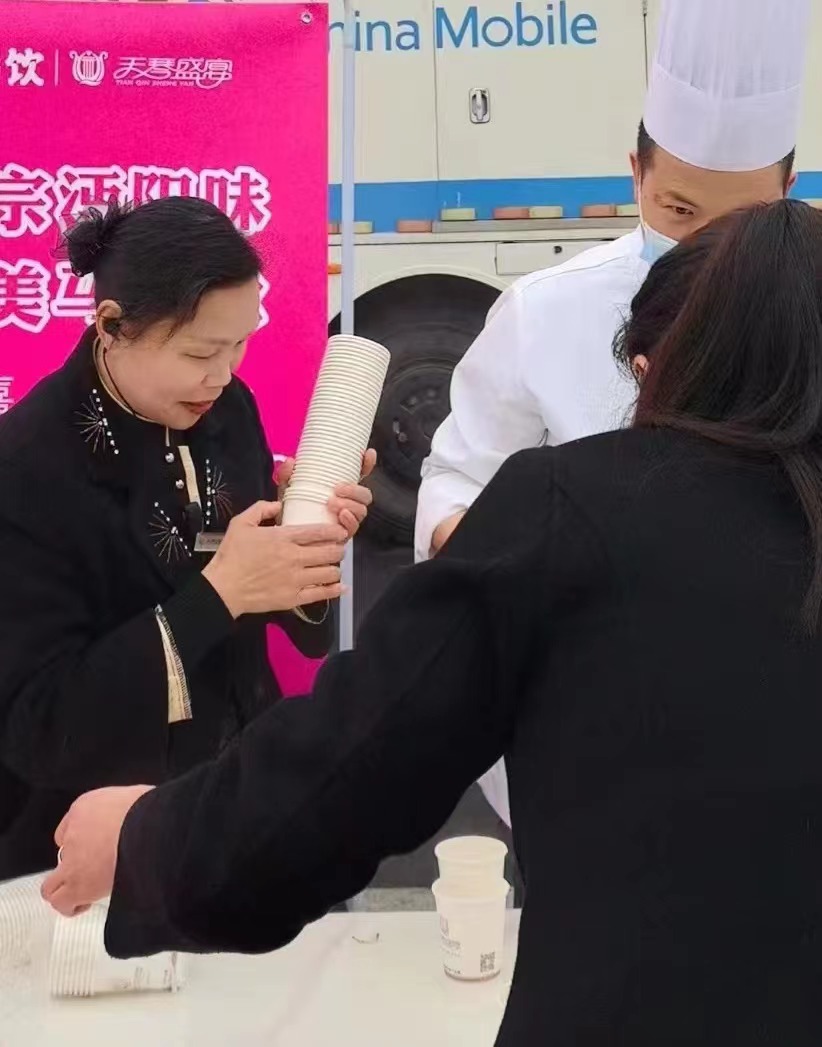 委员陈凤秀,是仙桃市吴刚餐饮集团的董事长,她亲自带领酒店的工作人员为参赛选手们现场提供各类美食,其中最有特色的就是仙桃“米团子”,为比赛免费提供盒饭3万份,银耳羹6000多份。